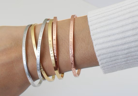 Cuff bracelets are a classic go-to for every style and join with trending timeless jewellery. They can be understated, with smooth, polished metal, or ornate with elaborate engravings and gemstones embedded in them. A statement cuff bracelet is just the thing for rounding out a formal outfit, while a minimalist cuff bracelet gives a taste of effortless style to an everyday look.